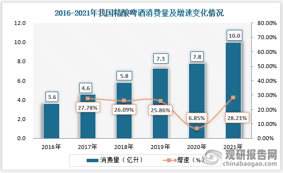 精釀啤酒的特點(diǎn)以及其飲用場(chǎng)景的多元使得其成為適應(yīng)社會(huì)發(fā)展走勢(shì)的產(chǎn)物,滿足了現(xiàn)代消費(fèi)者們快速多變的市場(chǎng)選擇。也正是如此精釀啤酒在我國(guó)已經(jīng)形成了自己獨(dú)特的精釀啤酒休閑文化,其愈發(fā)受到廣大消費(fèi)者的歡迎。消費(fèi)量來(lái)看,從2016年到2021年我國(guó)精釀啤酒消費(fèi)量逐年遞增,從2016年的3.6億升增長(zhǎng)至2021年的10億升左右。增速來(lái)看,除了2020年新冠疫情,全民居家隔離影響,其增速下降之外,2017年以來(lái)我國(guó)精釀啤酒消費(fèi)量增速均維持在25%以上。截止到2021年其消費(fèi)量增速更是達(dá)到了28.21%。