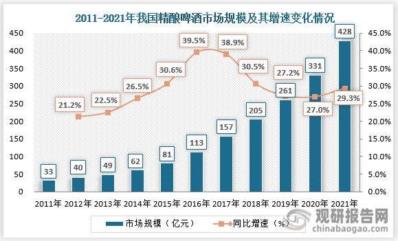 在我國(guó)精釀啤酒市場(chǎng)消費(fèi)量快速增長(zhǎng),企業(yè)紛紛入局背景下,行業(yè)市場(chǎng)也進(jìn)入了爆發(fā)增長(zhǎng)階段。市場(chǎng)規(guī)模來(lái)看,近十年來(lái)我國(guó)精釀啤酒行業(yè)市場(chǎng)規(guī)模均是逐年遞增態(tài)勢(shì),且增速均維持在20%以上。根據(jù)數(shù)據(jù)顯示,2011到2021年我國(guó)精釀啤酒市場(chǎng)規(guī)模從約33億元增長(zhǎng)至約428億元,實(shí)現(xiàn)了從幾十億元向幾百億元的跨越。增速來(lái)看,從2012年到2016年我國(guó)精釀啤酒市場(chǎng)規(guī)模增速也是呈現(xiàn)逐年遞增態(tài)勢(shì),在2016年其增速更是增長(zhǎng)至39.5%;此后盡管其增速開始出現(xiàn)小幅度下滑,但仍然維持在25%以上;截止到2021年我國(guó)精釀啤酒市場(chǎng)規(guī)模增速約為29.3%,較2020年又有所增長(zhǎng),增長(zhǎng)約2.3個(gè)百分點(diǎn)。