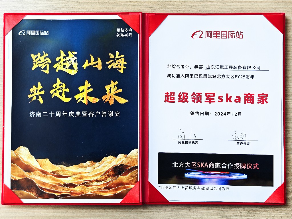 在 2024 年 12 月 ,山東匯冠工程裝備有限公司成功準(zhǔn)入阿里巴巴國(guó)際站北方大區(qū) FY25 財(cái)年,繼續(xù)保持超級(jí)領(lǐng)軍 SKA 商家,這也標(biāo)志著匯冠在國(guó)際貿(mào)易領(lǐng)域?qū)⒗^續(xù)新的征程,進(jìn)一步拓展海外市場(chǎng),提升企業(yè)在國(guó)際影響力與競(jìng)爭(zhēng)力,將在全球商業(yè)舞臺(tái)上迎來更多發(fā)展機(jī)遇。
